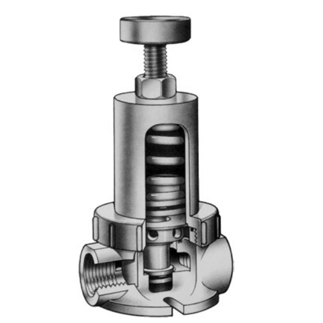 | Adjustable Pressure : The adjustable screw and lock nut allow for easy conversion of varying upstream pressure into a pre-set downstream pressure. The outlet pressure can be adjusted in a closed-loop system to a range of 15-100 PSI. |